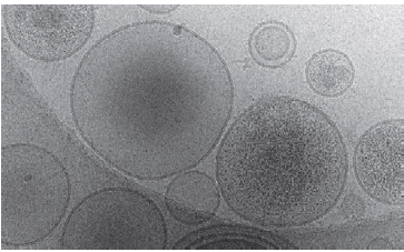 ヒト卵巣がん細胞から抽出したEVの凍結電子顕微鏡画像。単一クローン細胞から抽出したEVでも不均一であり、サイズも異なるが搭載する分子も多様であることが想定される。