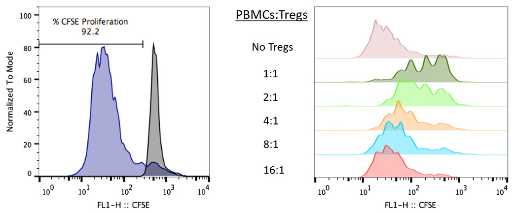 PBMCをCFSEで標識し、刺激の有無および異なる比率のTregと共培養した。4日間の培養後、CD8抗体で染色しフローサイトメトリーで解析した。