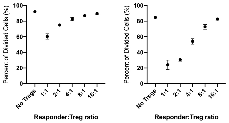 2人のドナー由来PBMCを同様の手法で解析し、CFSE希釈に基づくCD8陽性細胞の分裂率を評価した。レスポンダー:Treg比が低いほど、強い抑制効果が観察された。